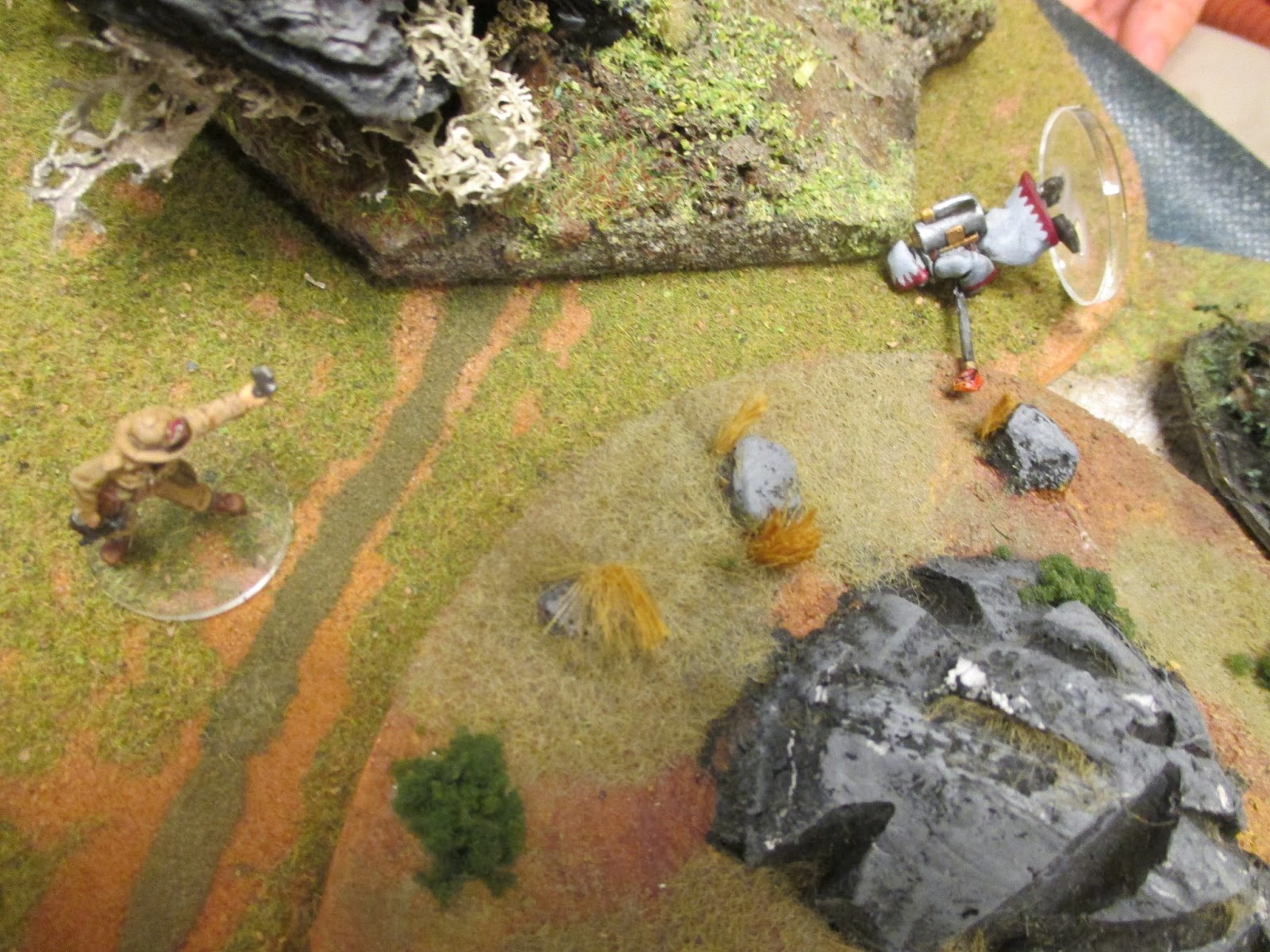 | The cowardly Belgian tries to hide in a crevice as Both Padre Scuro and Soldato Morto blasts him. He survives the ordeal... for now. (He runs away when he activates later in the turn) |